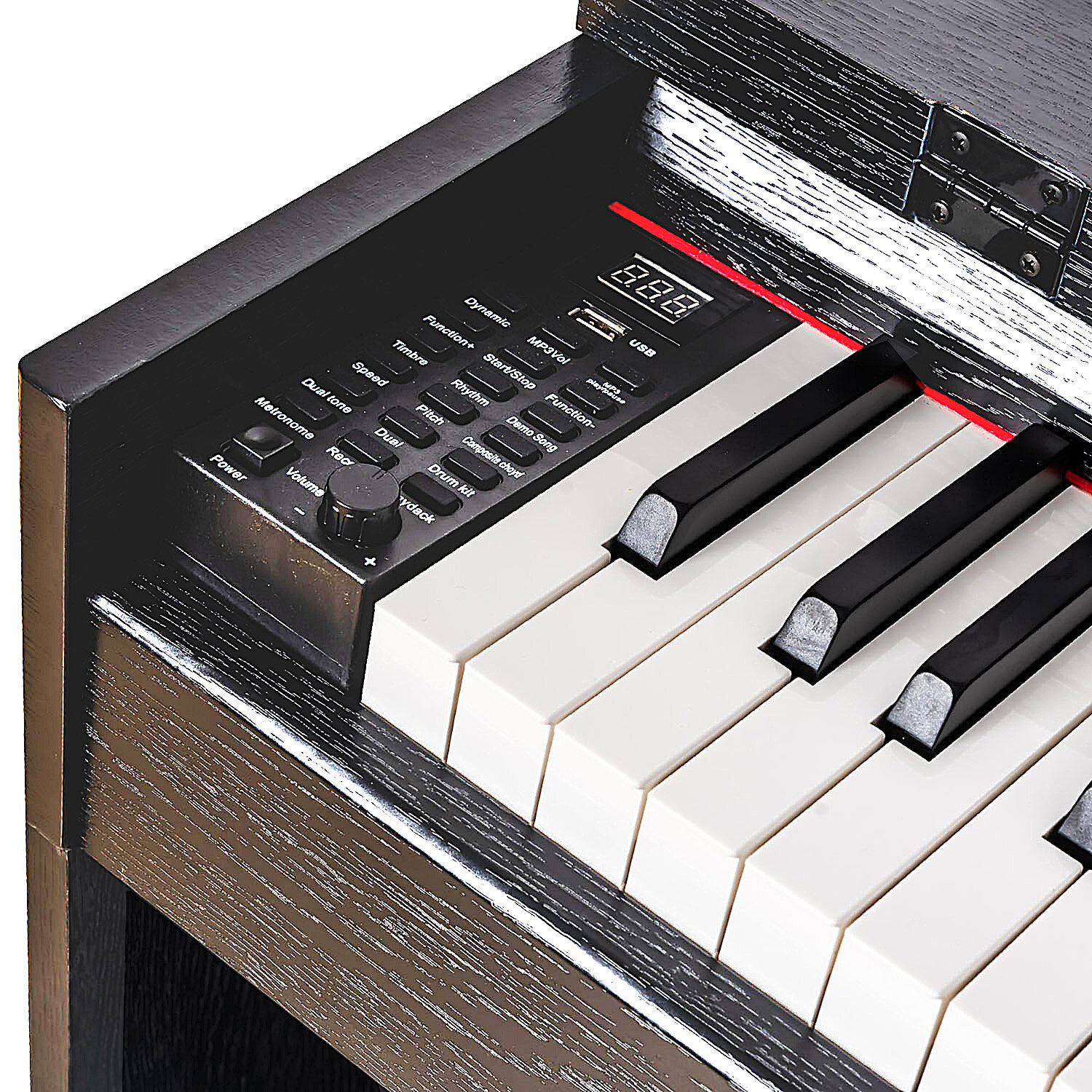 Инструментът има тежка и динамична клавиатура, като на истинско пиано. С три педала.